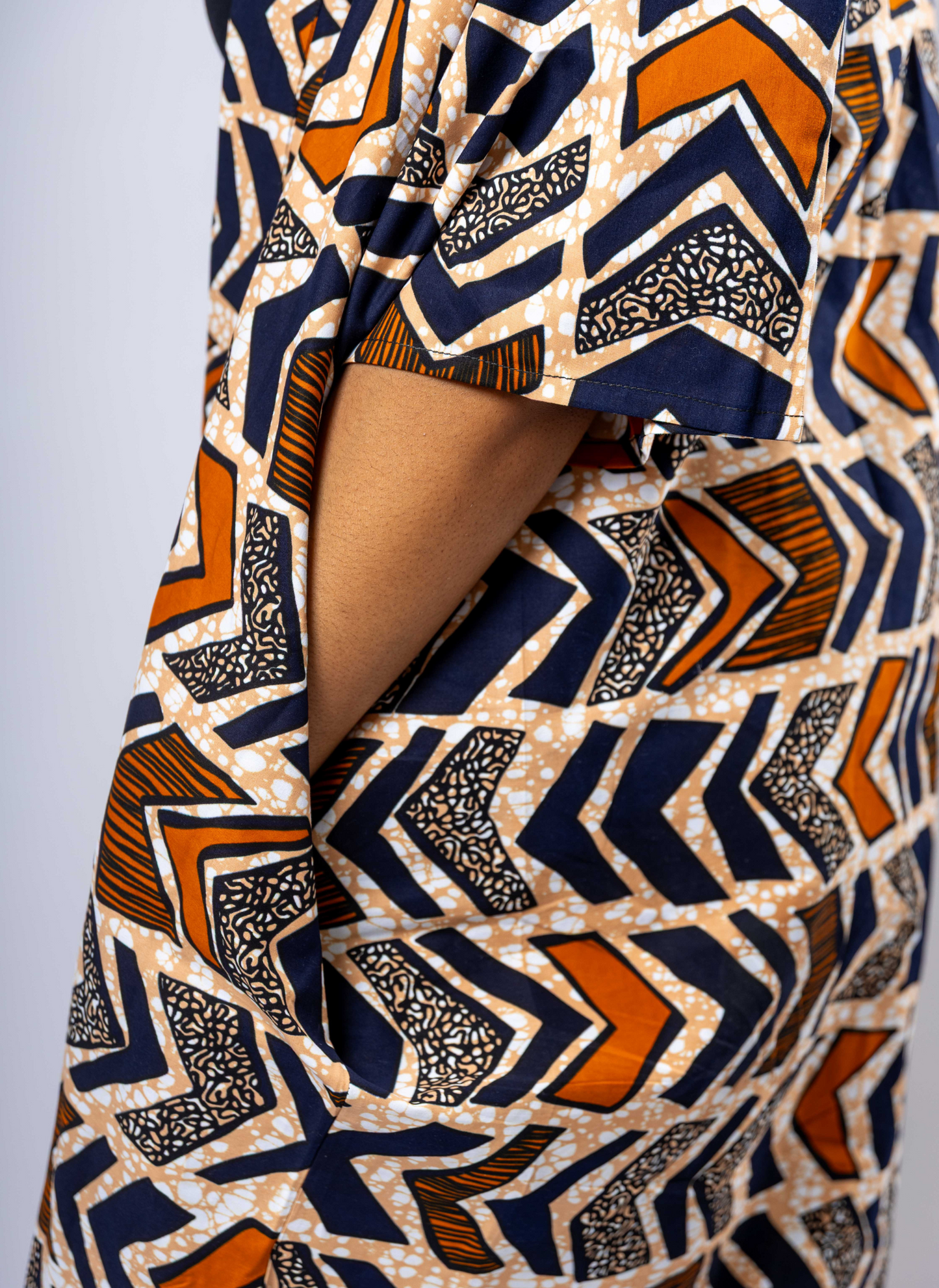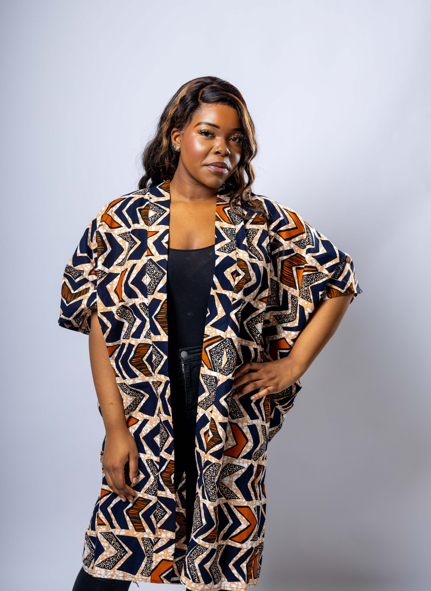 Unleash your inner fire with the Lekki Kimono. This bold, African-inspired print features symbolic directionality and a dynamic geometric pattern in warm earth tones. The lightweight yet structured design allows for all-day wear, while the spacious pockets and mid-length provide versatility. One size fits all. Are you ready to make a statement and confidently walk your divine path?