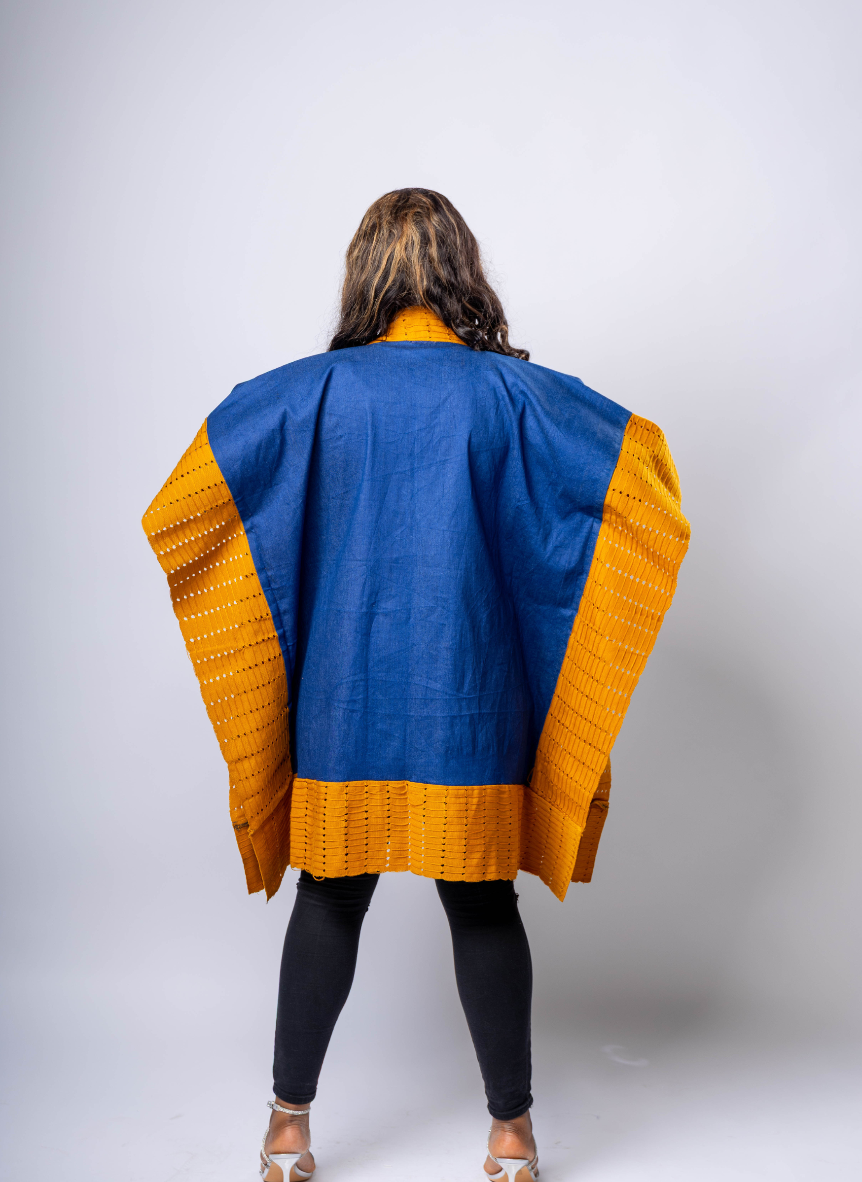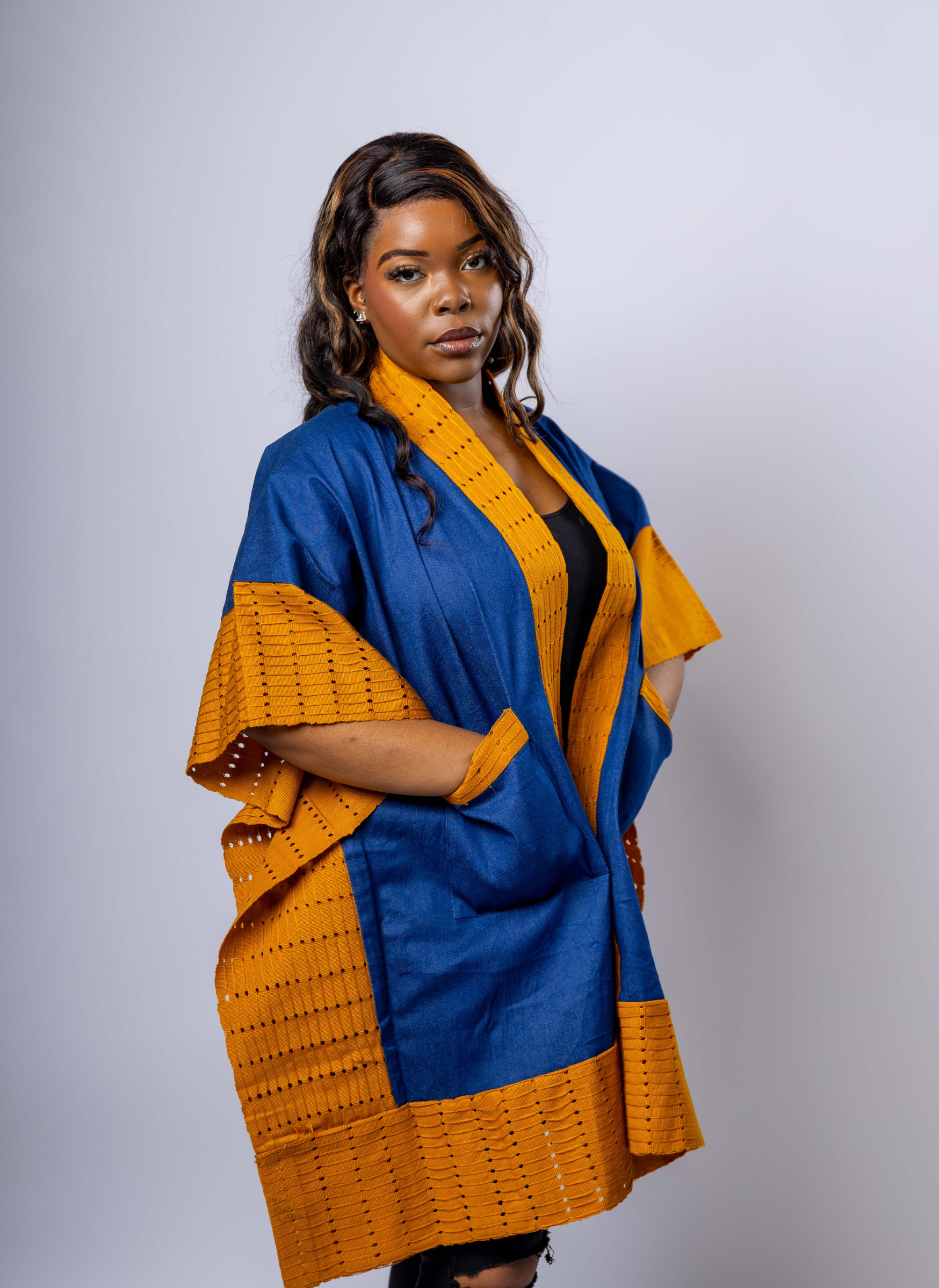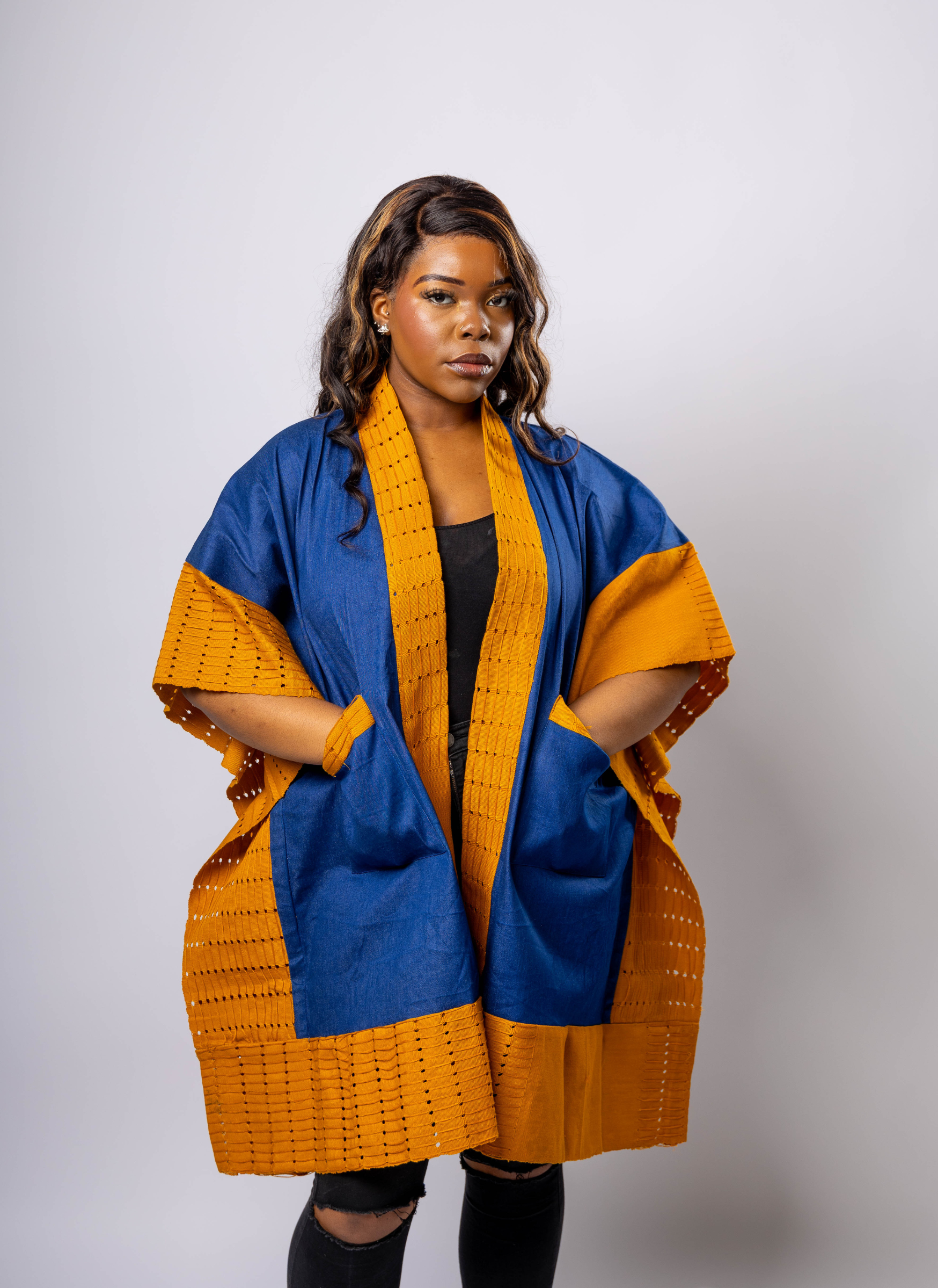 Experience the rare fusion of structured denim and hand-woven Silk Aso Oke—crafted for visibility, comfort and utility. Limited availability means now is the time to add this standout, trans-seasonal kimono to your collection.