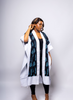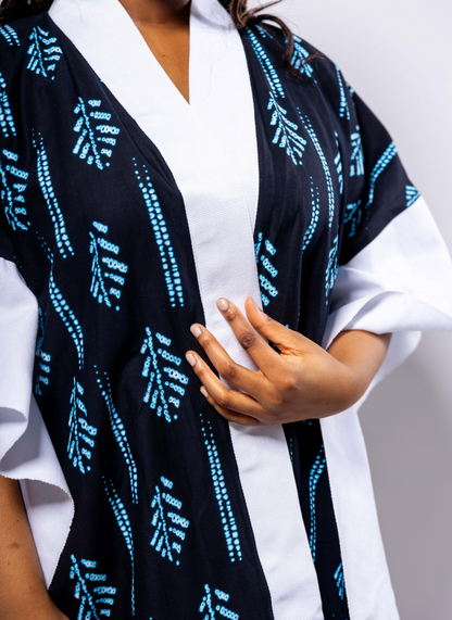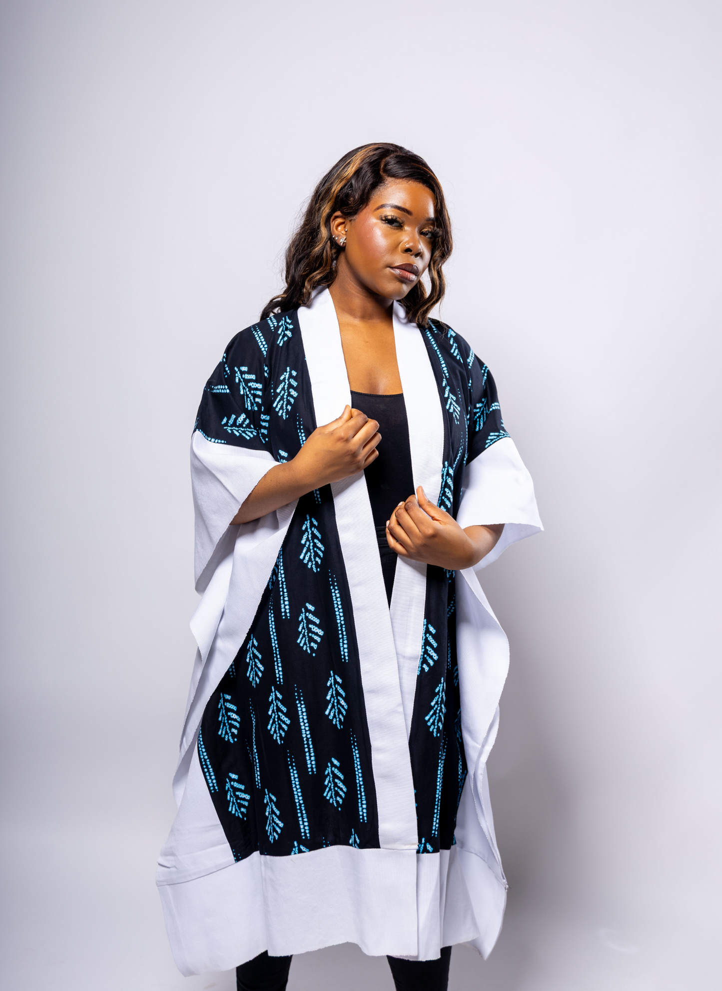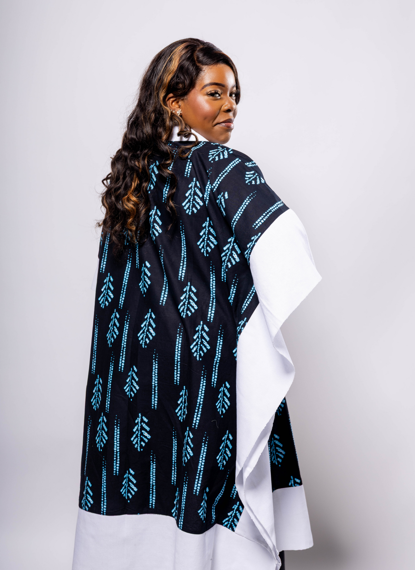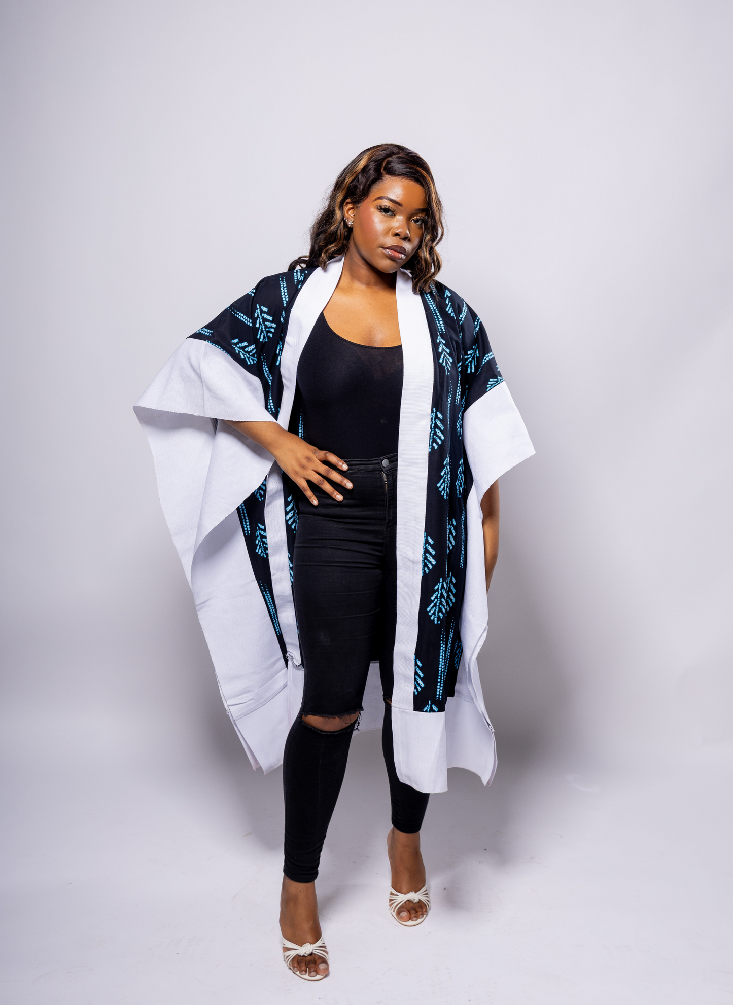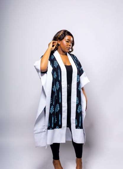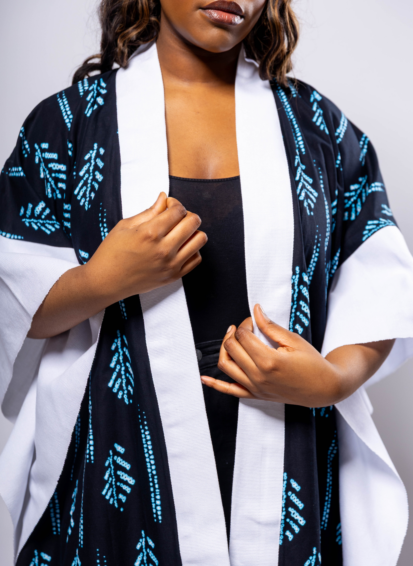 Introducing the Ananya Kimono - a timeless piece that embodies elegance and grace. Its bold black base with sky-blue tribal motifs and crisp white border exudes strength, wisdom, and divine guidance. Made with premium African print fabric, this kimono effortlessly drapes and adds a regal touch to any outfit. Perfect for any occasion, let the Ananya Kimono speak for you without saying a word.