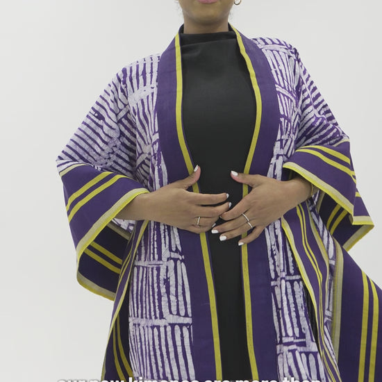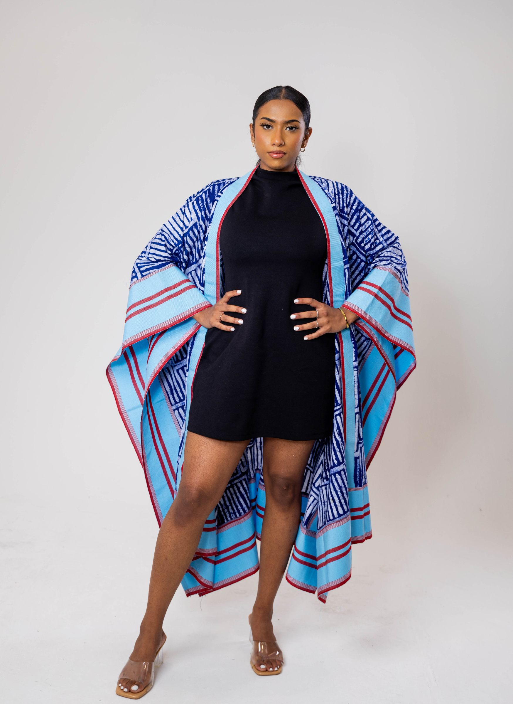 The kimono’s body is hand-dyed using traditional Adire resist techniques, so no two pieces are identical. These artisanal indigo patterns create instant visual interest and a genuinely unique wardrobe staple.