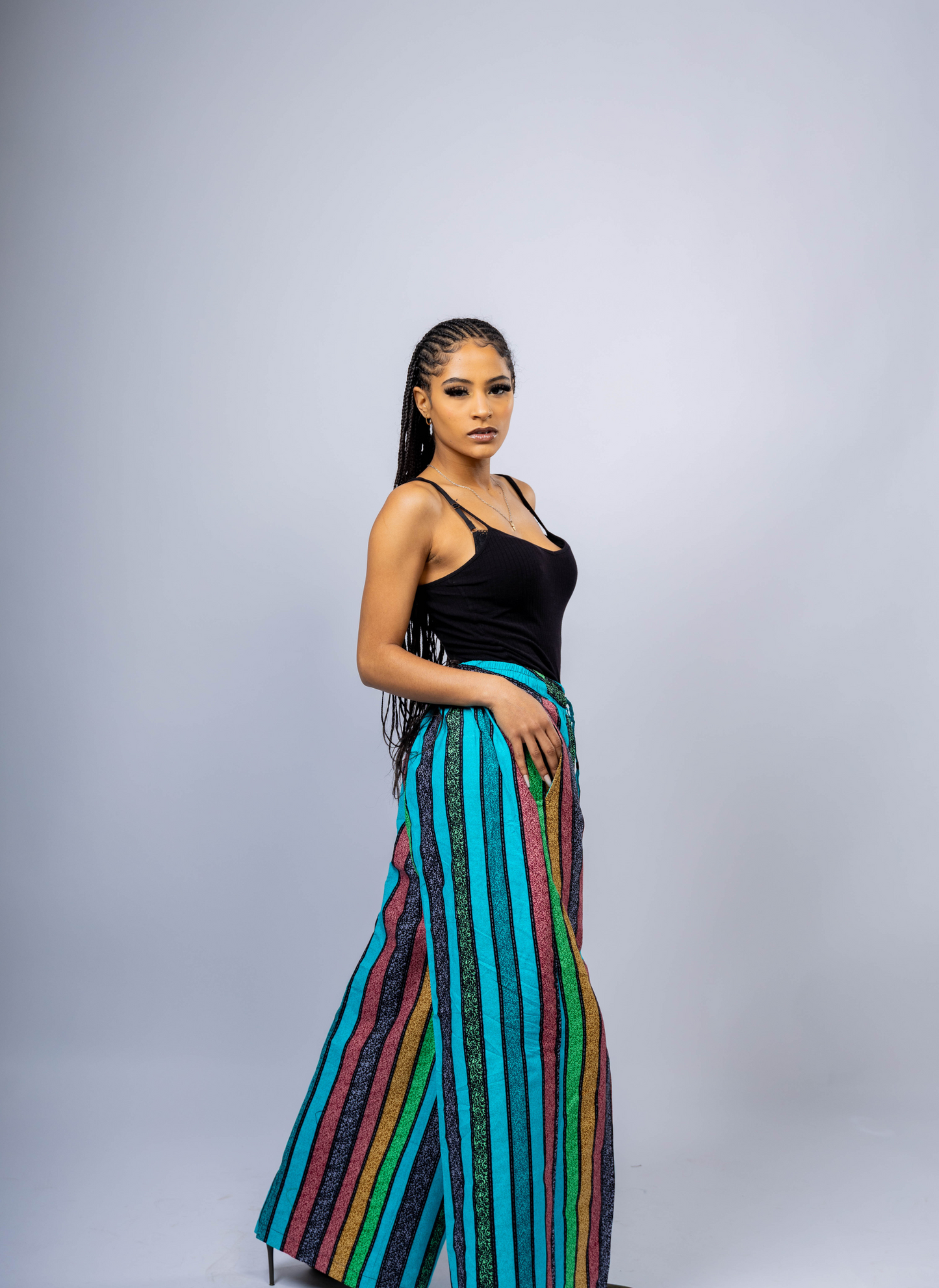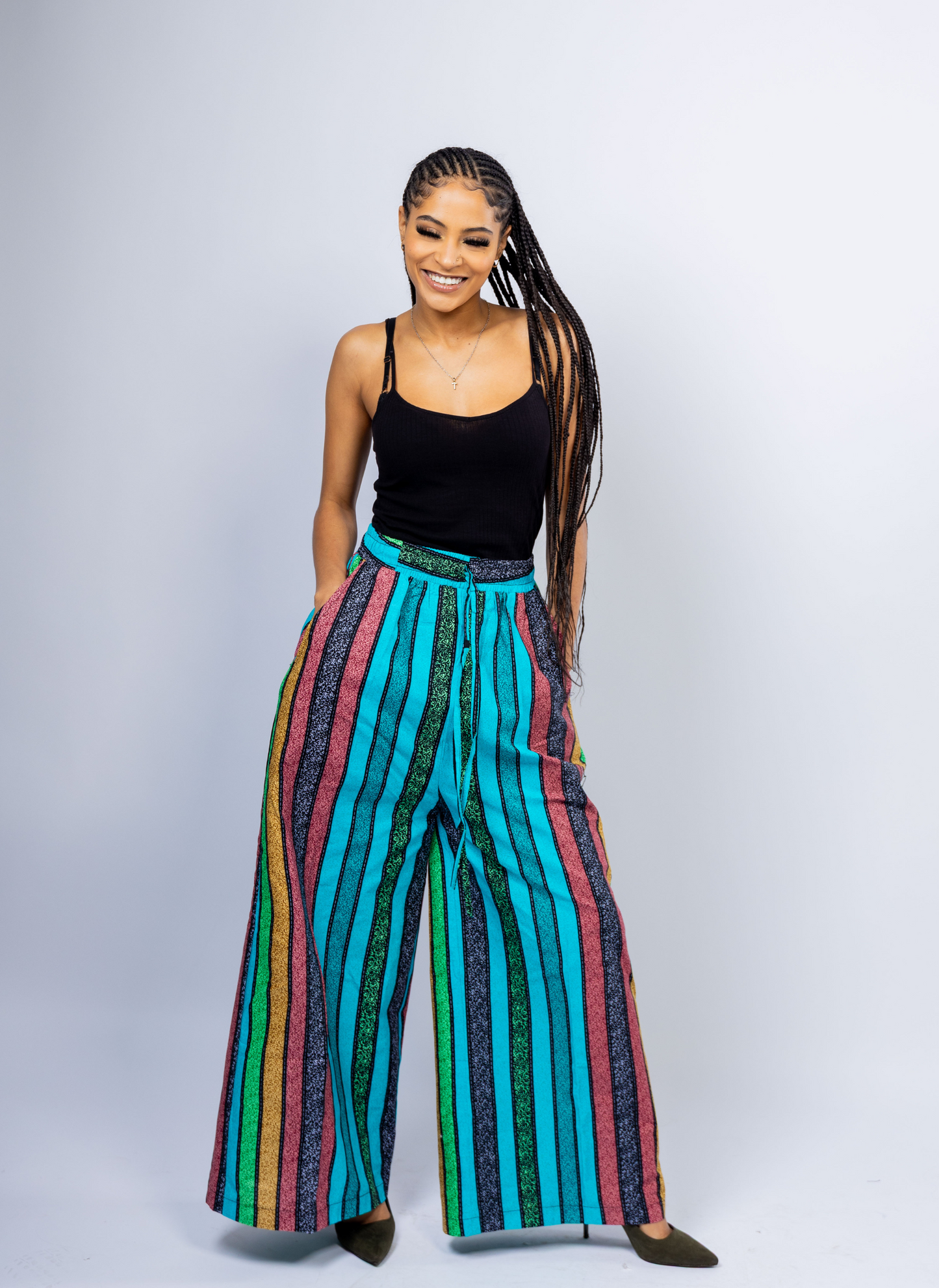 Perfect for everything from casual slay to festival flair or a stylish vacation look, these African-inspired striped palazzos are both eye-catching and comfortable. Featuring a stretchy high-waisted fit, adjustable drawstring, and functional side pockets, they combine beauty and practicality for all-day wear.
