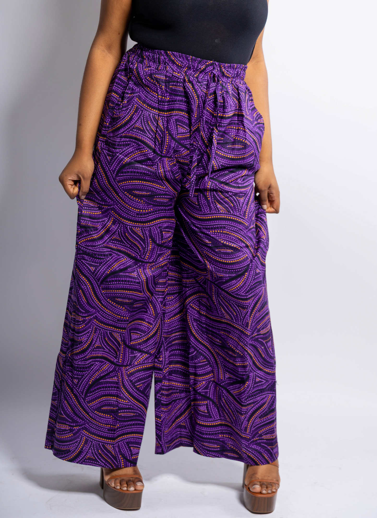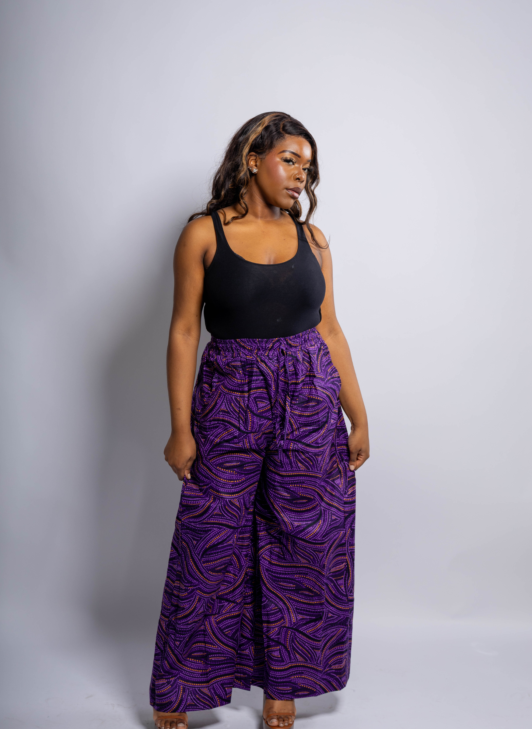 Step into effortless royalty with this Ankara Palazzo Trousers, where comfort meets culture in a bold purple swirl print that demands attention. These wide-leg African print trousers are a must-have for queens who love freedom of movement, functional fashion, and flattering silhouettes that embrace every curve.