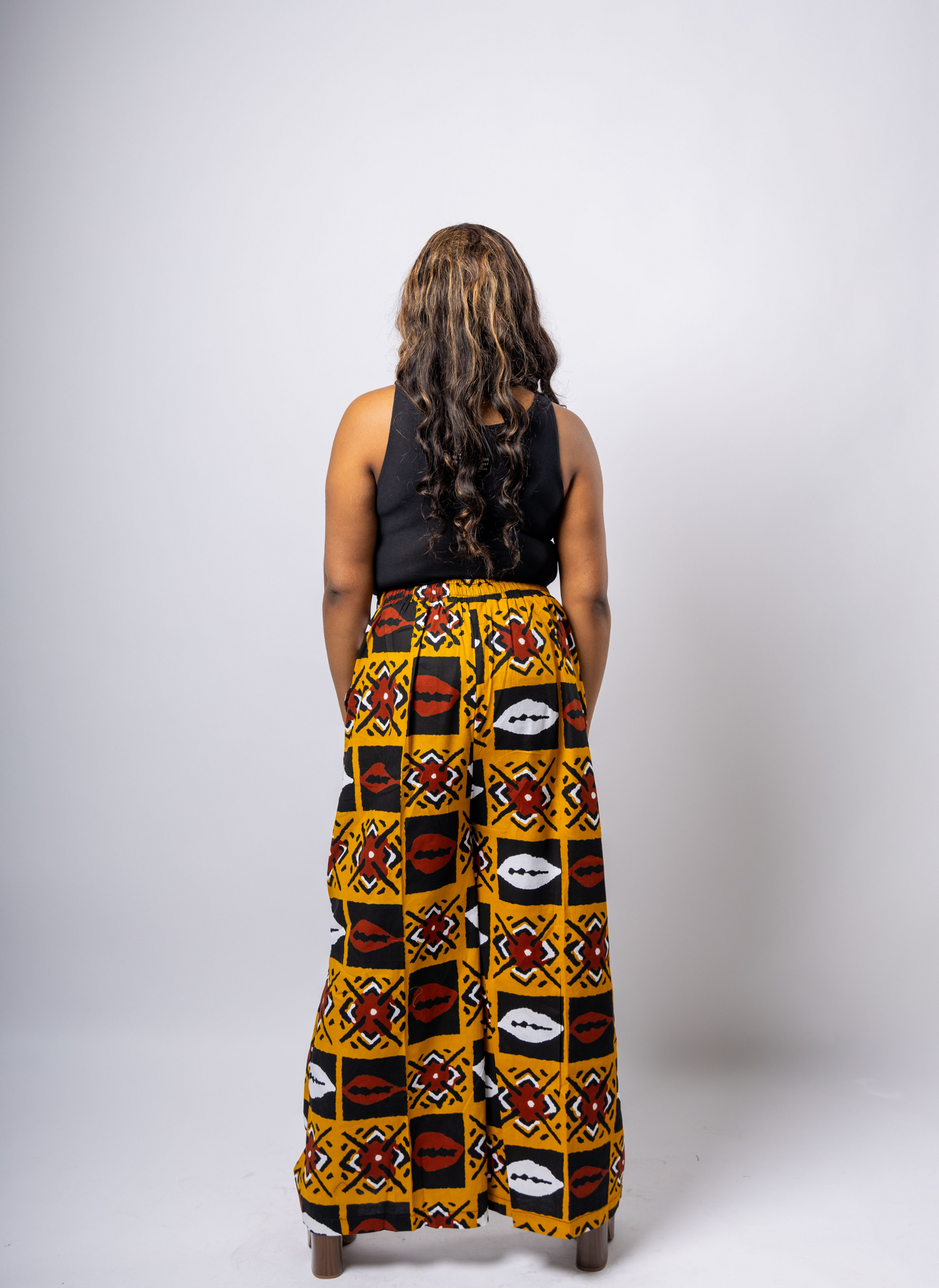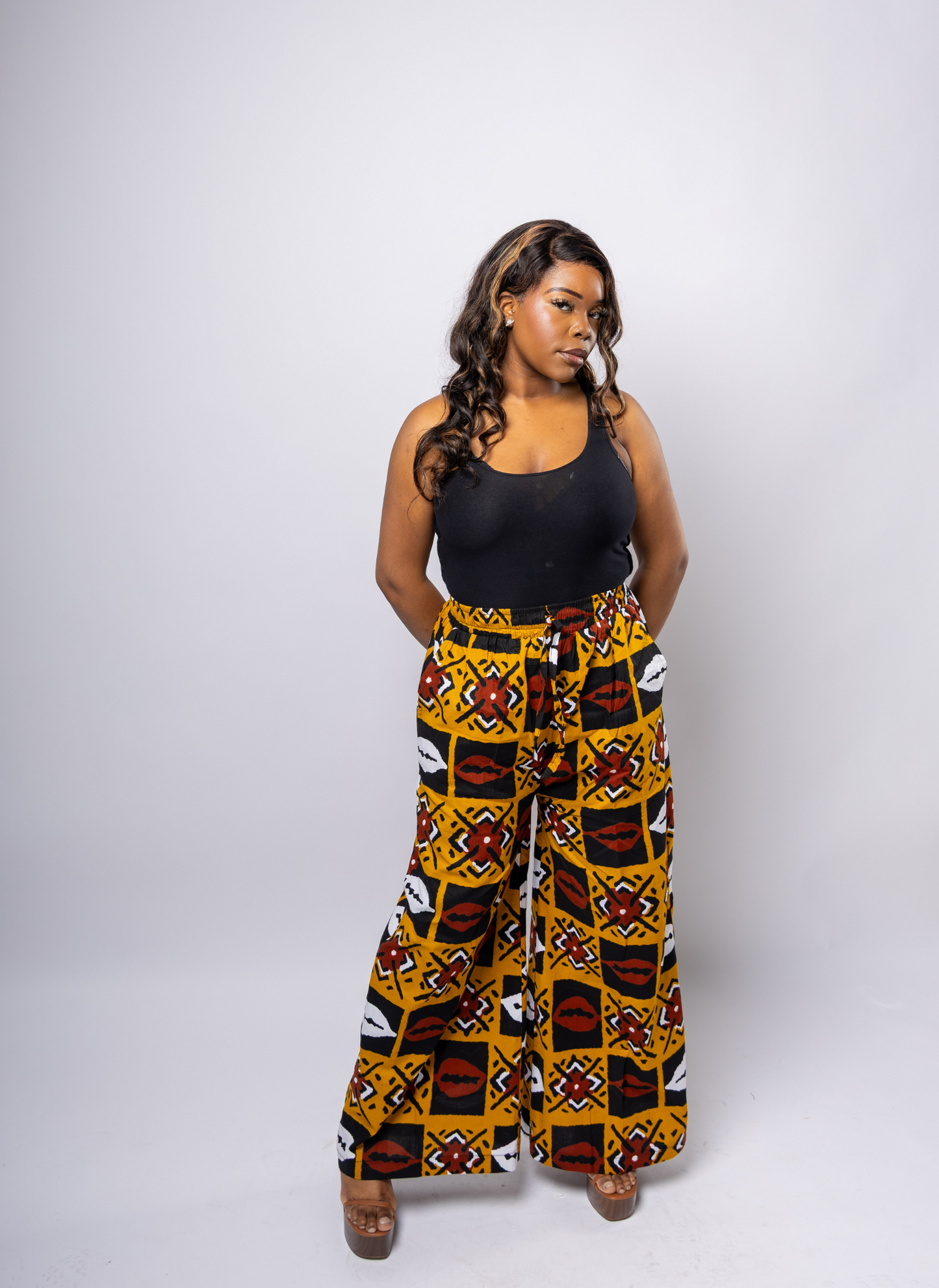 Make a fierce statement with this Afro Pop Palazzo Trousers, designed for bold hearts and unstoppable women. Featuring a vibrant mustard yellow base adorned with kiss print motifs and tribal-inspired symbols, these African print wide-leg trousers are a celebration of culture, creativity, and comfort.