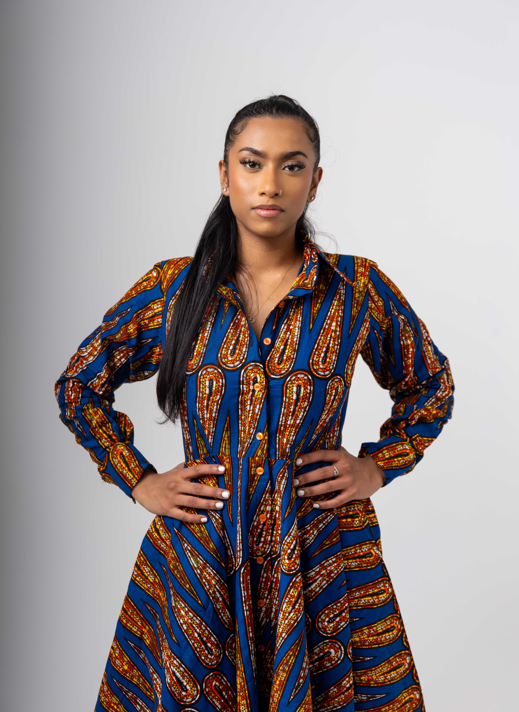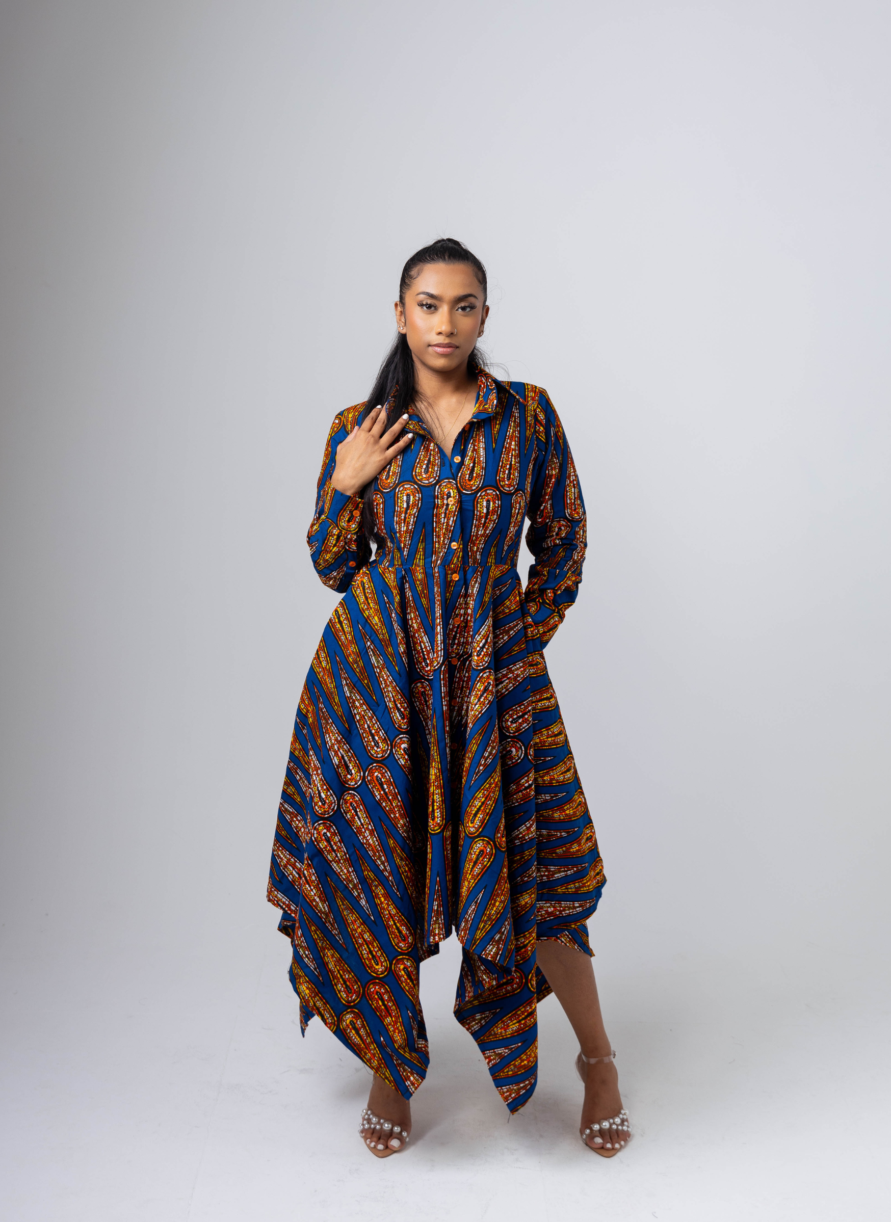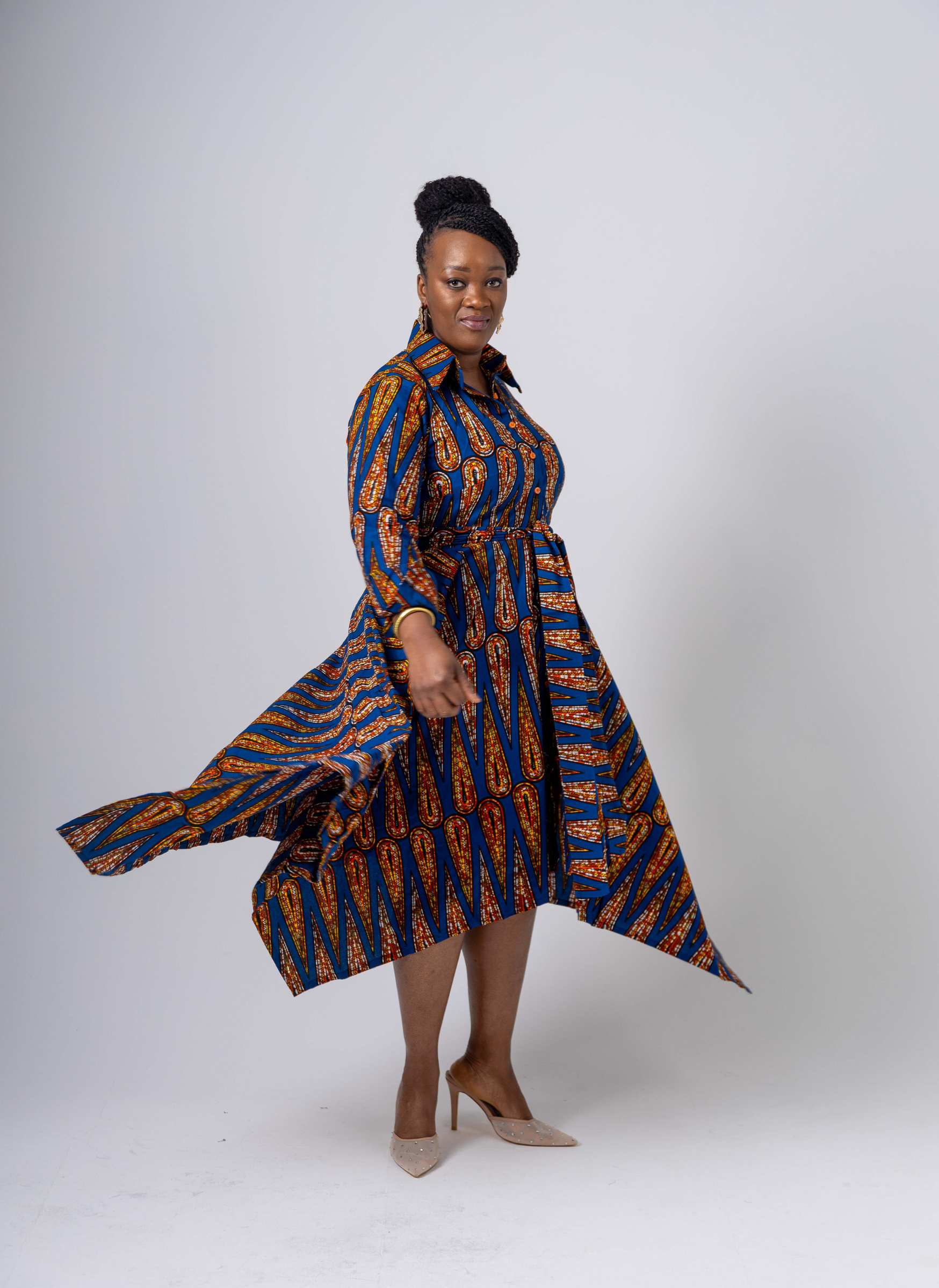 Crafted from 100% African print wax cotton, the Derin Shirt Dress features an asymmetric hem, optional belt, pockets, and buttons. Make a statement with this come back eye-catching dress and create your own unique look. Feel confident and inspired, and don't wait any longer to add this dress to your wardrobe!