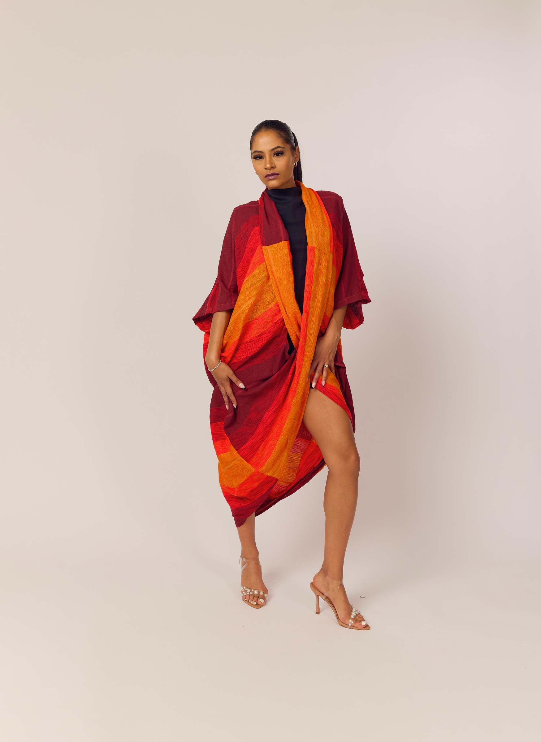 Step into effortless elegance with the Ewa Draped Kaftan Dress, handcrafted from 100% handwoven Moroccan cotton and dyed in radiant hues that honour your power and peace.