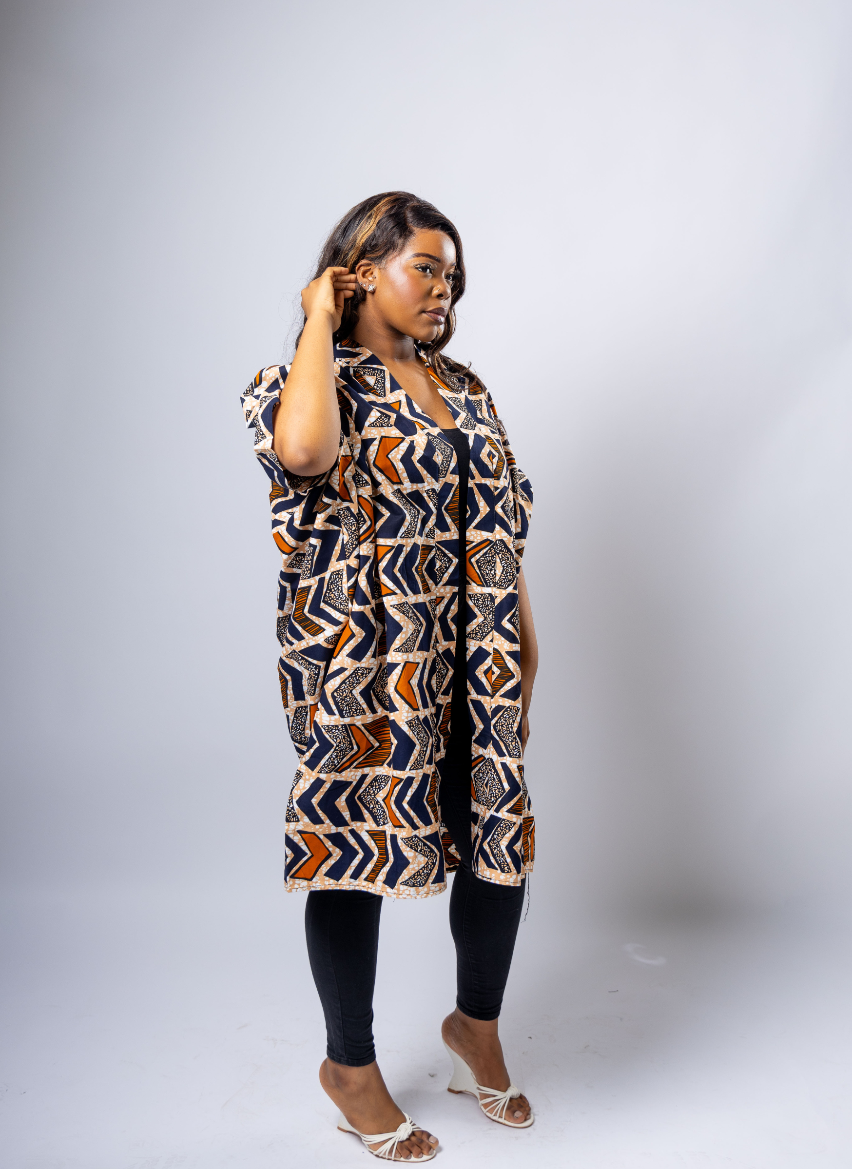 Unleash your inner fire with the Lekki Kimono. This bold, African-inspired print features symbolic directionality and a dynamic geometric pattern in warm earth tones. The lightweight yet structured design allows for all-day wear, while the spacious pockets and mid-length provide versatility. One size fits all. Are you ready to make a statement and confidently walk your divine path?