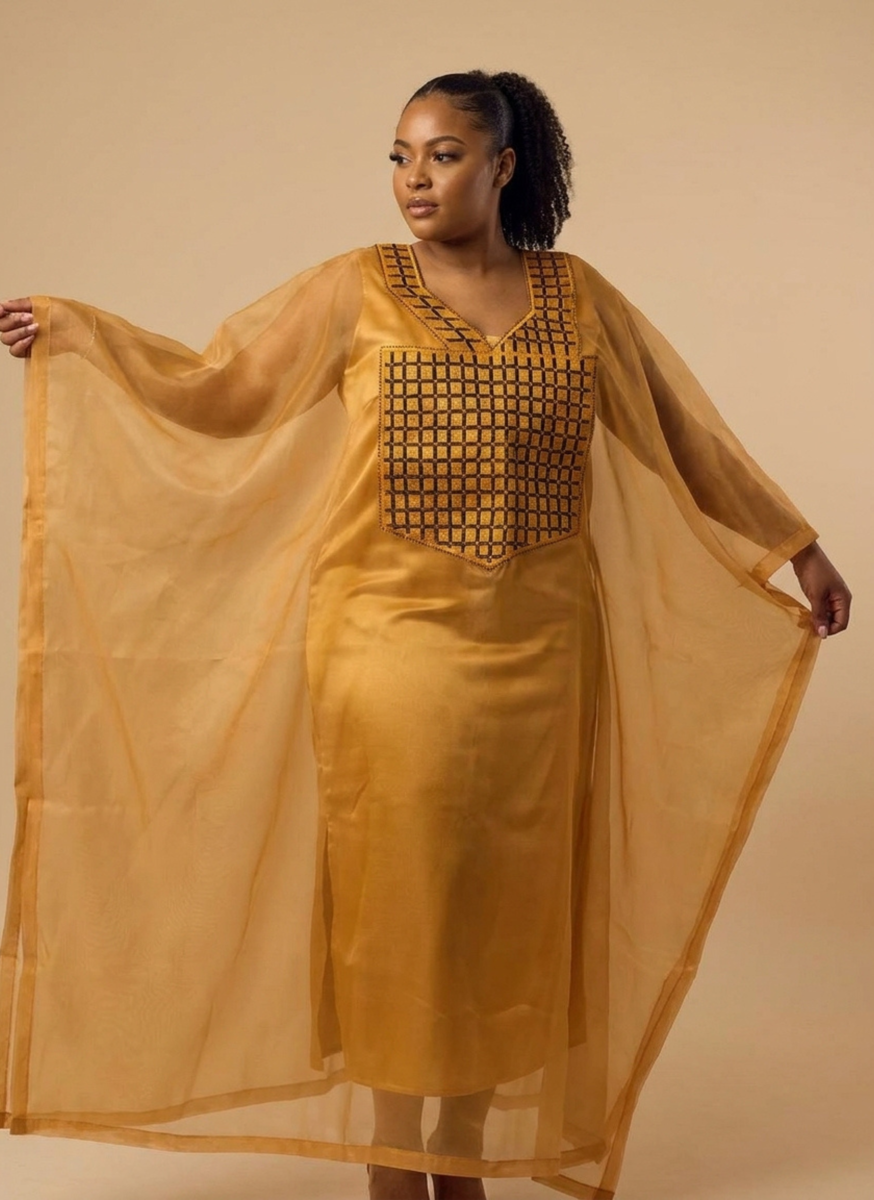 True luxury is felt before it is seen. The Zainab Boubou is a masterclass in "Royal Simplicity"—combining the ethereal float of sheer organza with the grounded prestige of hand-stitched embroidery. This is the garment for the woman who leads with quiet power and undeniable grace.